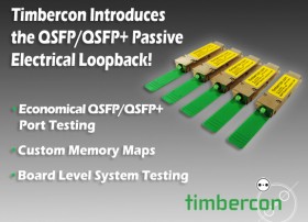 Timbercon, Inc., a fiber optic product and solution manufacturing company, announced today the availability of the QSFP/QSFP+ passive electrical loopback. The electrical loopback is used for testing QSFP/QSFP+ transceiver ports in board level test. Substituting the electrical loopback for a full featured transceiver provides a more cost effective, low cost alternative.