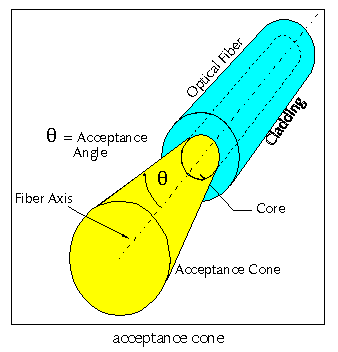 The largest Launch Angle of Incident Light that can propogate down the Fiber optic. The 3D view of the angle represents a cone.